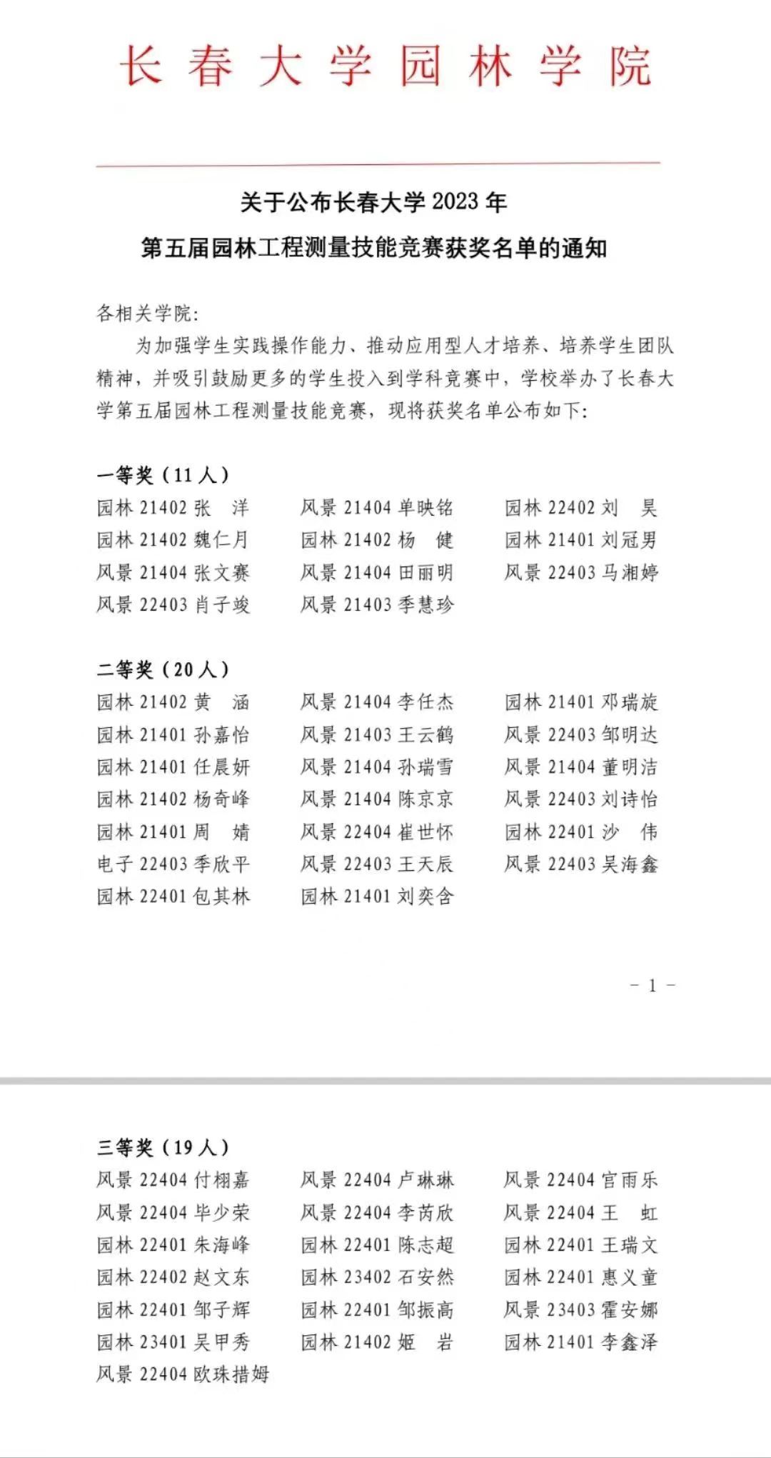 最终比赛顺利落下帷幕,随后由老师针对比赛结果评选出一二三等奖。此次活动有利于推动园林测量在国民经济中的应用,如园林苗圃规划设计,城市公园规划设计,城市绿地和住宅小区绿化设计和施工等等,对于园林专业学生的就业与职业发展都能起到很好的促进作用。让我们一览竞赛获奖名单吧!