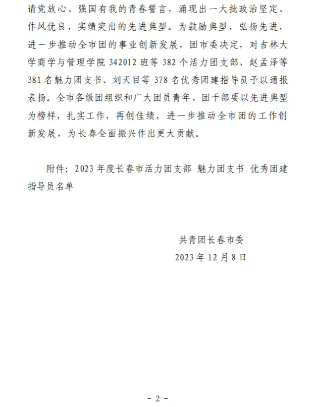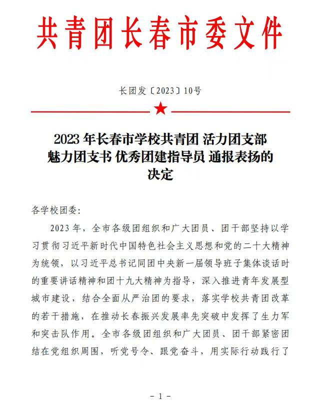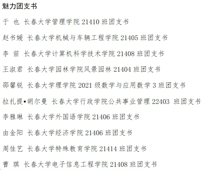 在2023年长春市学校共青团 “活力团支部”“魅力团支书”“优秀团建指导员”评选中,yl6809永利官网20402班团支部获2023年度长春市活力团支部、21404班团支书王淑君获2023年度长春市魅力团支书、团委书记刘鑫鑫获2023年度长春市优秀团建指导员!