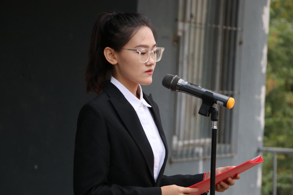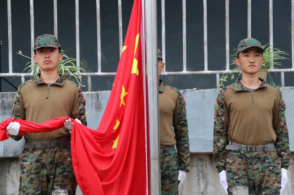 “升国旗,奏唱国歌”主持人话语一落,掌旗员振臂扬起国旗,五星红旗刹那迎风绽放,全体师生庄严肃穆,面向五星红旗,致以最崇高的注目礼。