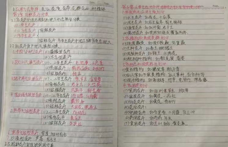 笔记上工整的文字,荧光笔的备注,红色的标注,圈点勾画,图文结合……都展现了园林学子善于归纳,积极向上的品质。
